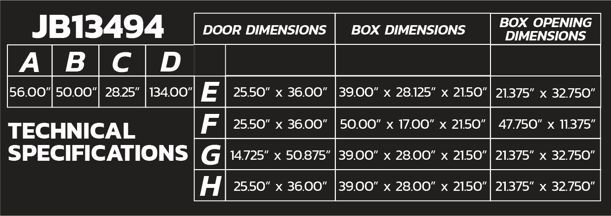 The JB13494 is a heavy-duty service body built for demanding job sites. Engineered with rugged steel construction, secure lockable compartments, and a full-length master lock system, it delivers dependable durability and organized storage for efficient field operations across industries.